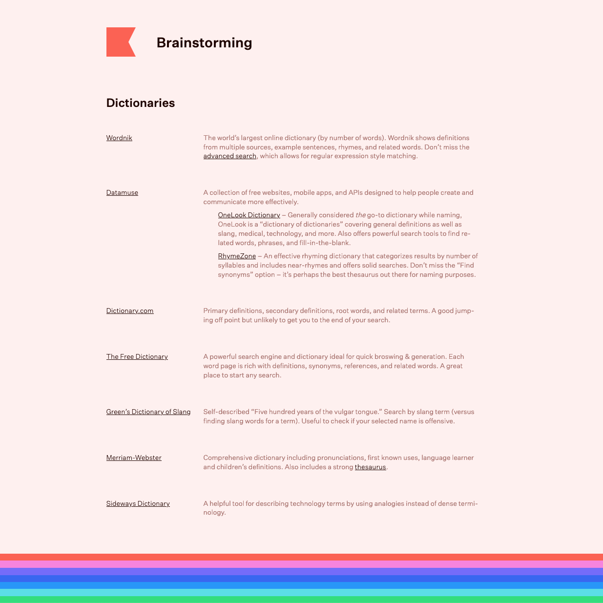 Onym resourcesNaming in hard (ask me how long it took to find "The Curiosity Cove"). So Onym offers a long list of resources to help you coin the perfect name for your project, company, band, whatever.