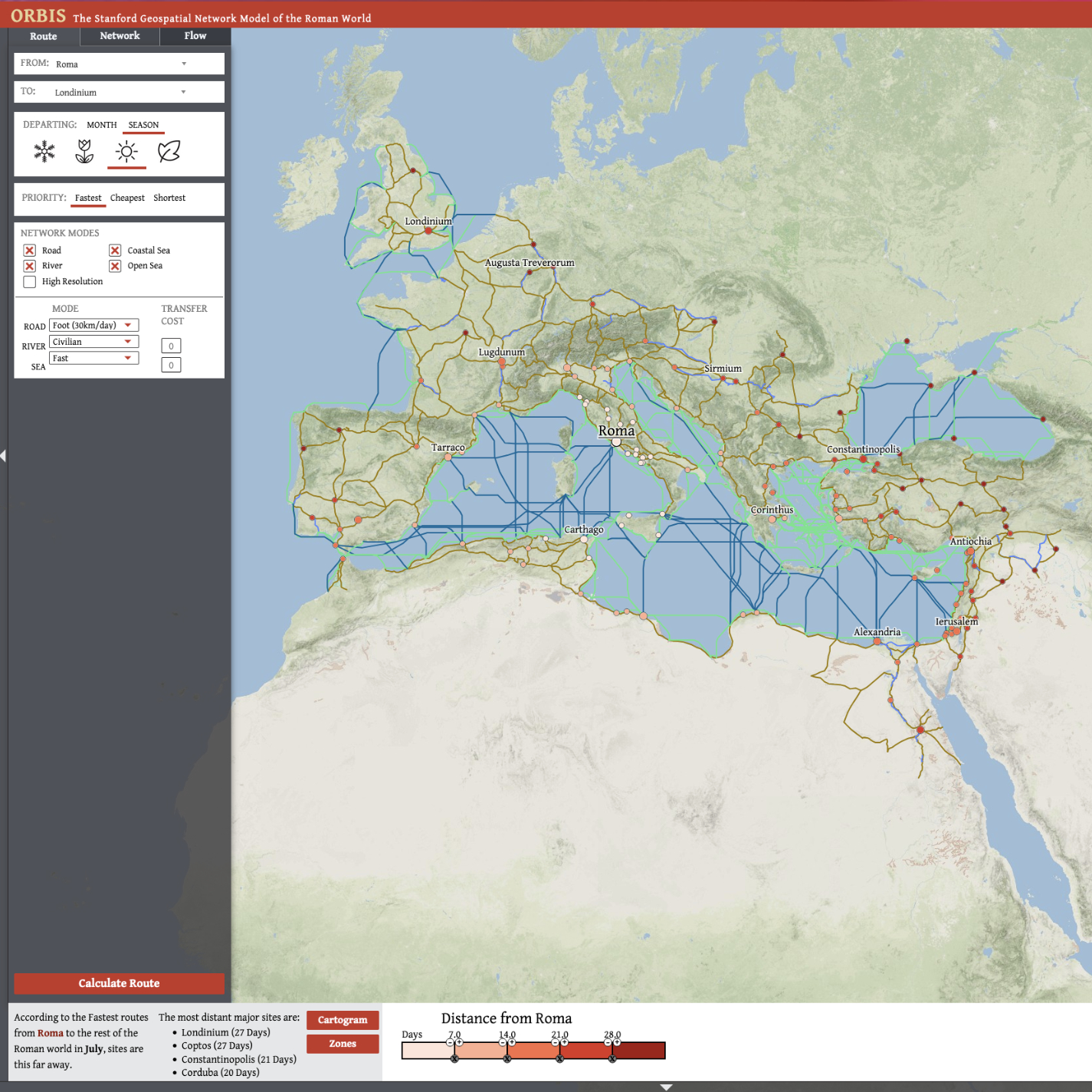 Orbis is The Stanford Geospatial Network Model of the Roman World, and it reconstructs the time cost and financial expense associated with a wide range of different types of travel in antiquity