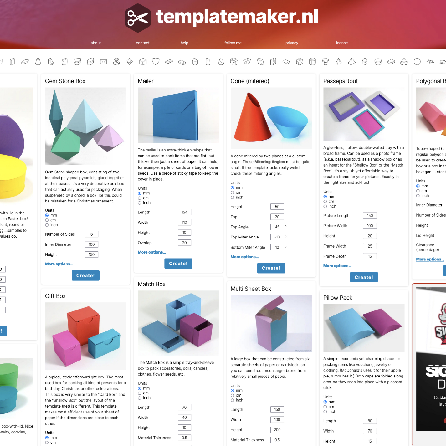 Template maker offers templates for more than 30 different shapes that can be used to package or display items, to decorate, or even to play (see the Soma Cube). You can customize the size of every template, and sometimes more (the number of branches on the star-shaped templates, for example).
